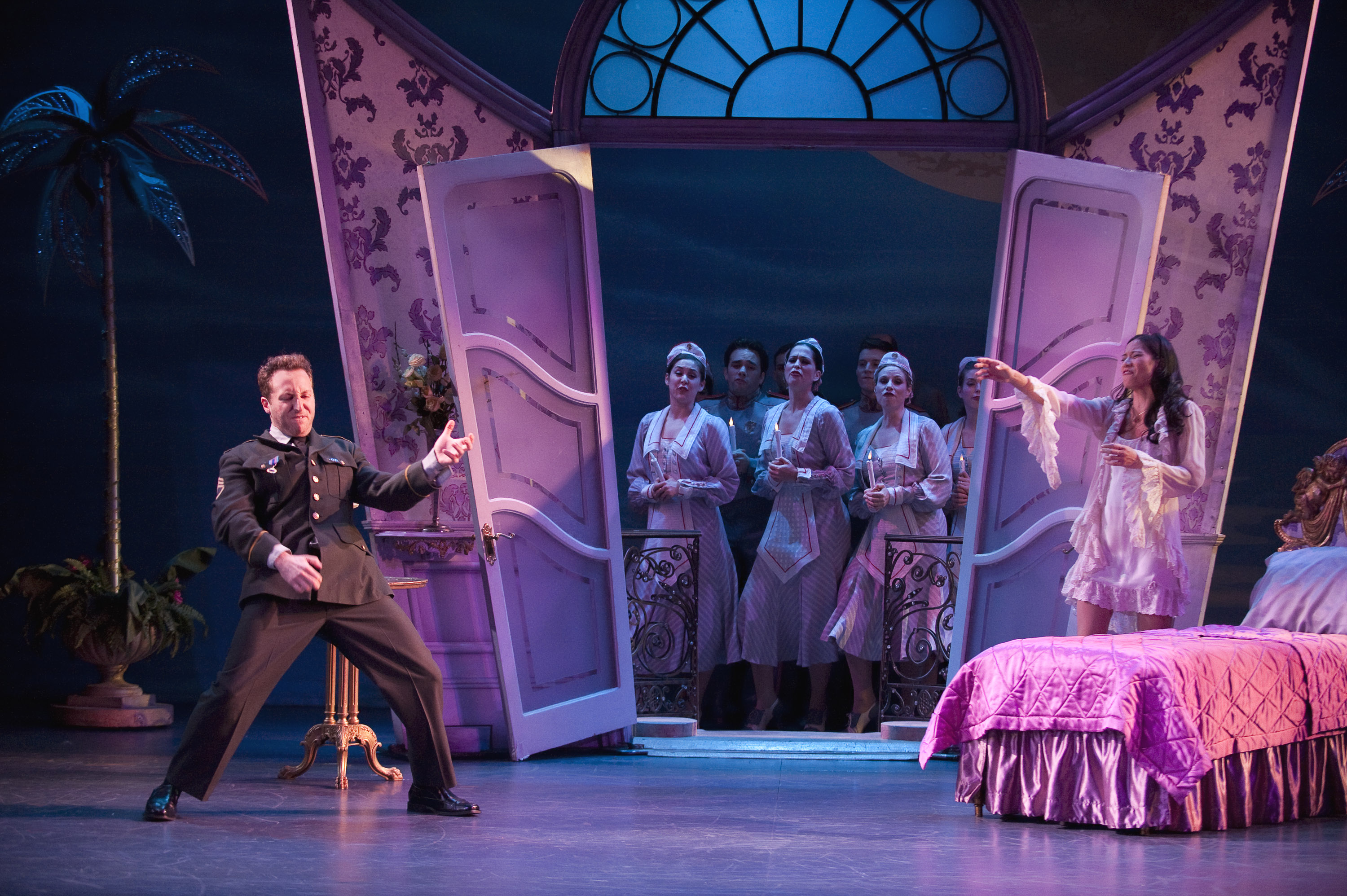 Elena Juatco plays the accident-prone American Soap Queen, Christine Colgate, the unwitting mark in Freddy and Lawrence’s unscrupulous bet.  Juatco is best known for making it into the top six of the second season of Canadian Idol and has since transitioned her talents to the theatre.  Her singing voice is sweet and tender but at times its thinness threatened to give way.  Ultimately it didn’t matter, as Juatco is consummately charming and radiates likeability from her first appearance to her final bow.